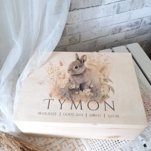 Pudełko z drewna, dostępne jest w 4 wariantach wielkości: małe (30x20x12), kwadratowe (30x30x12), średnie (40x30x12) i duże (40x30x22). Posiadają z boku wycięte uchwyty (z wyjątkiem pudełka kwadratowego). Pomieści wiele skarbów dziecka, albo pierwsze wspomnienia: zdjęcie USG, pierwszą pieluszkę, body, smoczek, zdjęcie z rodzicami. Będzie wspaniałą pamiątką i wspomnieniem dziecka z dzieciństwa. To piękny prezent z okazji narodzin, czy chrztu, do wewnątrz można włożyć kocyk, pościel, bodziaki, itp i skomponować w ten sposób wspaniały prezent dla maluszka.