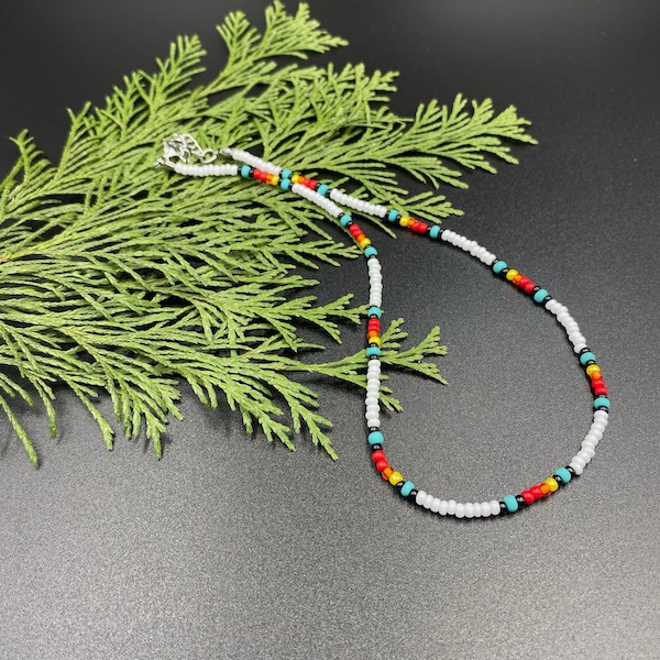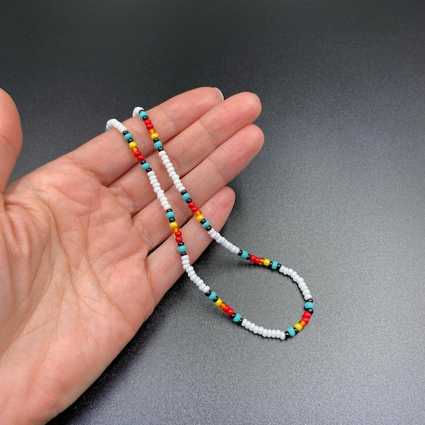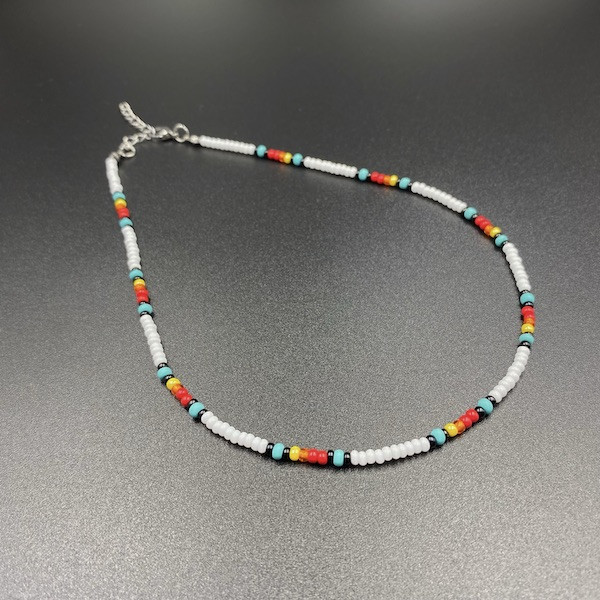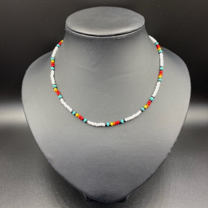 Krótki naszyjnik został wykonany ręcznie ze szklanych koralików w kolorze białym, czerwonym, czarnym, turkusowym, pomarańczowym, żółtym.