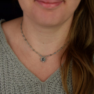Oryginalny naszyjnik w kształcie słońca z połyskującymi na kolorowo labradorytami. Wykonany ręcznie techniką wire wrapping z drutów ze stali chirurgicznej. Naszyjnik jest krótki i ma długość 40,5-44cm, ale mogę dowolnie zmienić jego długość, na końcu łańcuszka regulacyjnego zawiesiłam kulkę labradorytu. Słońce ma średnicę około 1,8cm. Naszyjnik jest wysyłany losowo. Na zdjęciu przedstawione są przykładowe naszyjniki.