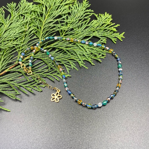 Krótki naszyjnik został wykonany ręcznie z czeskich, szklanych koralików Fire Polish 4 mm o kryształowej, połyskującej powłoce w bladych odcieniach niebieskiego, srebrnego, morskiego, żółtego i zielonego.