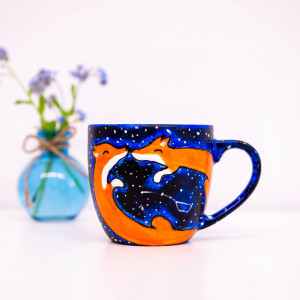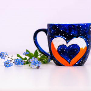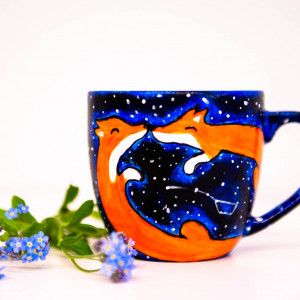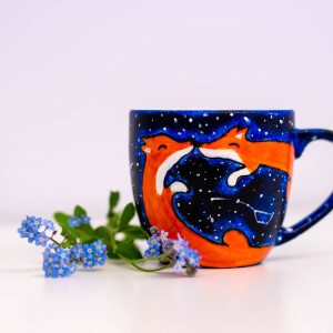 Kubek ręcznie malowany z motywem zakochany lisów i nocnej gwieździstej scenerii. Będzie idealnym prezentem dla wyjątkowej osoby, gdy chcemy podarować coś unikatowego.