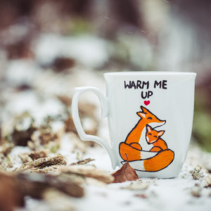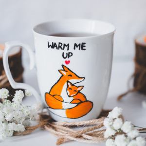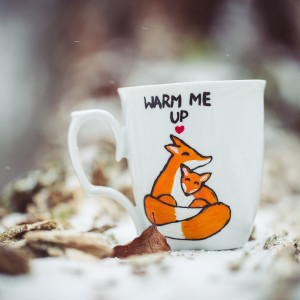 Kubek ręcznie malowany z motywem przytulających się lisów i napisem: Warm me up.