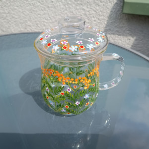 Szklany kubek ze szklanym zaparzaczem i pokrywką a na nim złocisty wrotycz i kwietna łączka.
