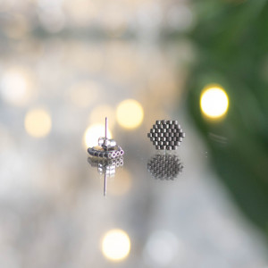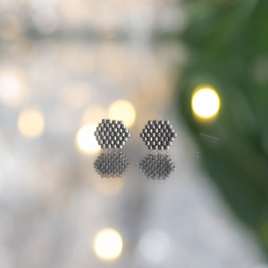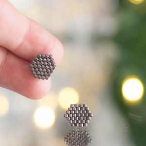 Kubiki, czyli małe kolczyki o kształcie sześcianu. Wyplecione ręcznie z drobnych szklanych koralików wysokiej jakośći (Miyuki lub Toho), a zamocowane na sztyfcie ze stali chirurgicznej (316L).