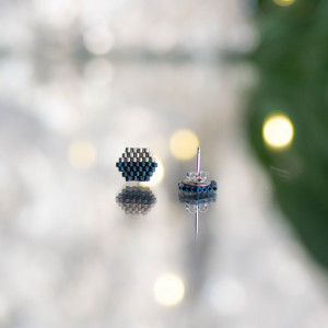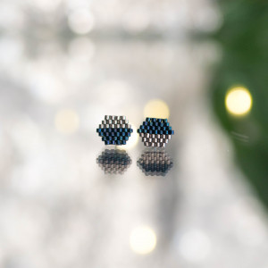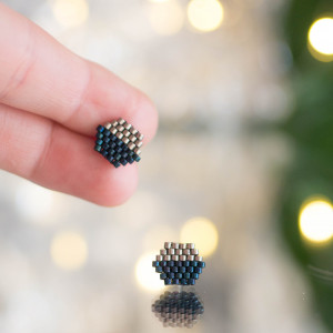 Kubiki, czyli małe kolczyki o kształcie sześcianu. Wyplecione ręcznie z drobnych szklanych koralików wysokiej jakośći (Miyuki lub Toho), a zamocowane na sztyfcie ze stali chirurgicznej (316L).