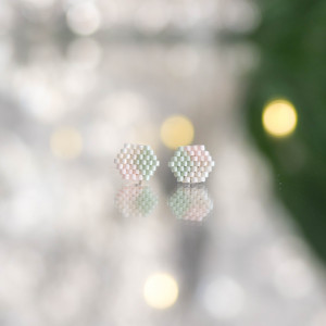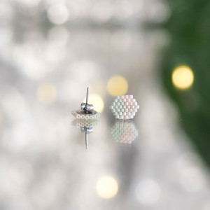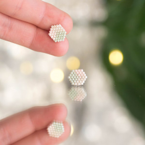 Kubiki, czyli małe kolczyki o kształcie sześcianu. Wyplecione ręcznie z drobnych szklanych koralików wysokiej jakośći (Miyuki lub Toho), a zamocowane na sztyfcie ze stali chirurgicznej (316L).