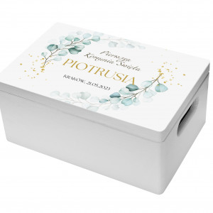 Pudełko z drewna, dostępne jest w 4 wariantach wielkości: małe (30x20x12), kwadratowe (30x30x12), średnie (40x30x12) i duże (40x30x22). Posiadają z boku wycięte uchwyty (z wyjątkiem pudełka kwadratowego). Będzie wspaniałą pamiątką i wspomnieniem dziecka z I Komuni Świętej. Jest to idelane rozwiązanie do przechowywania pamiątek z tego ważnego dnia.