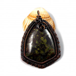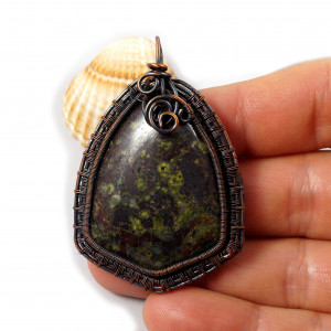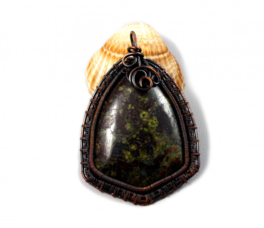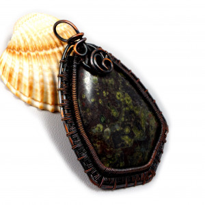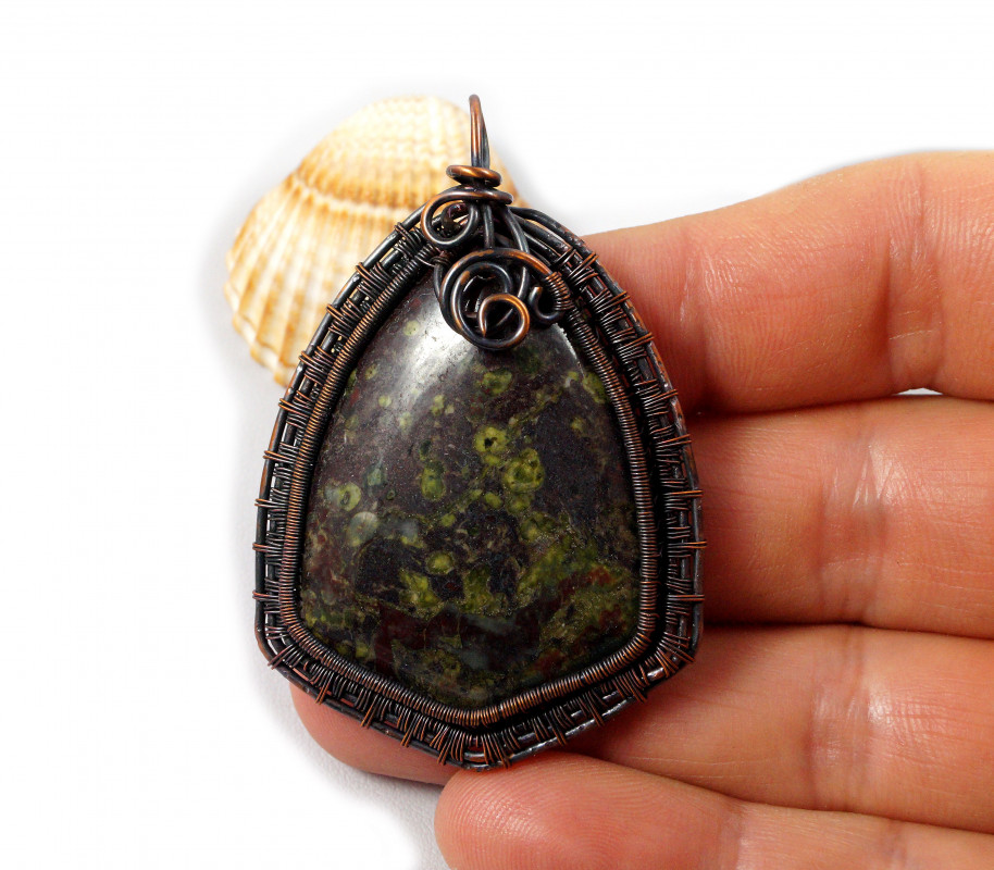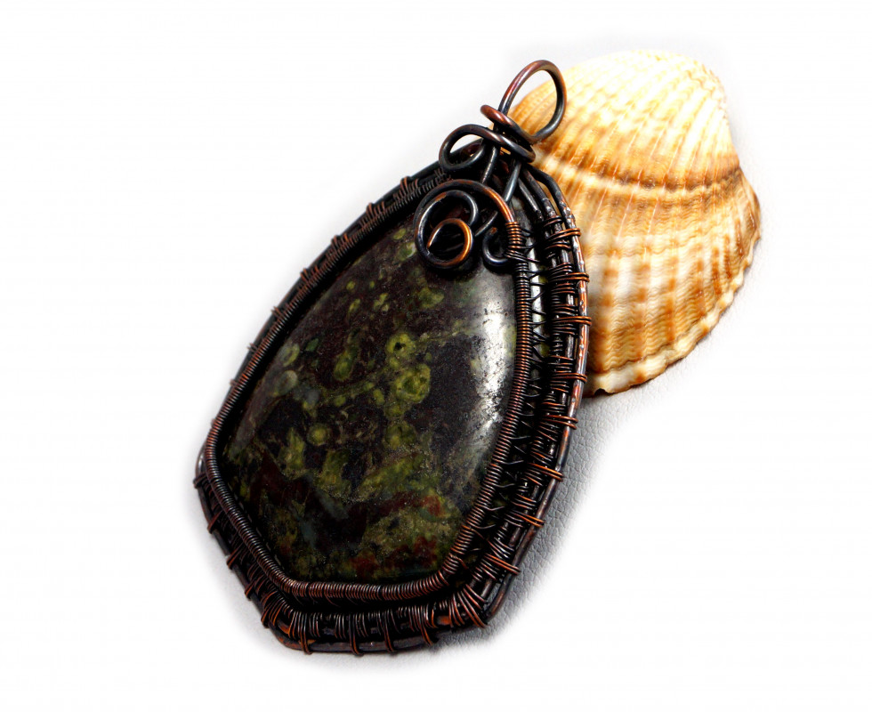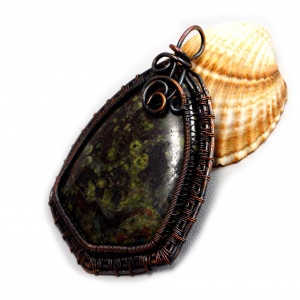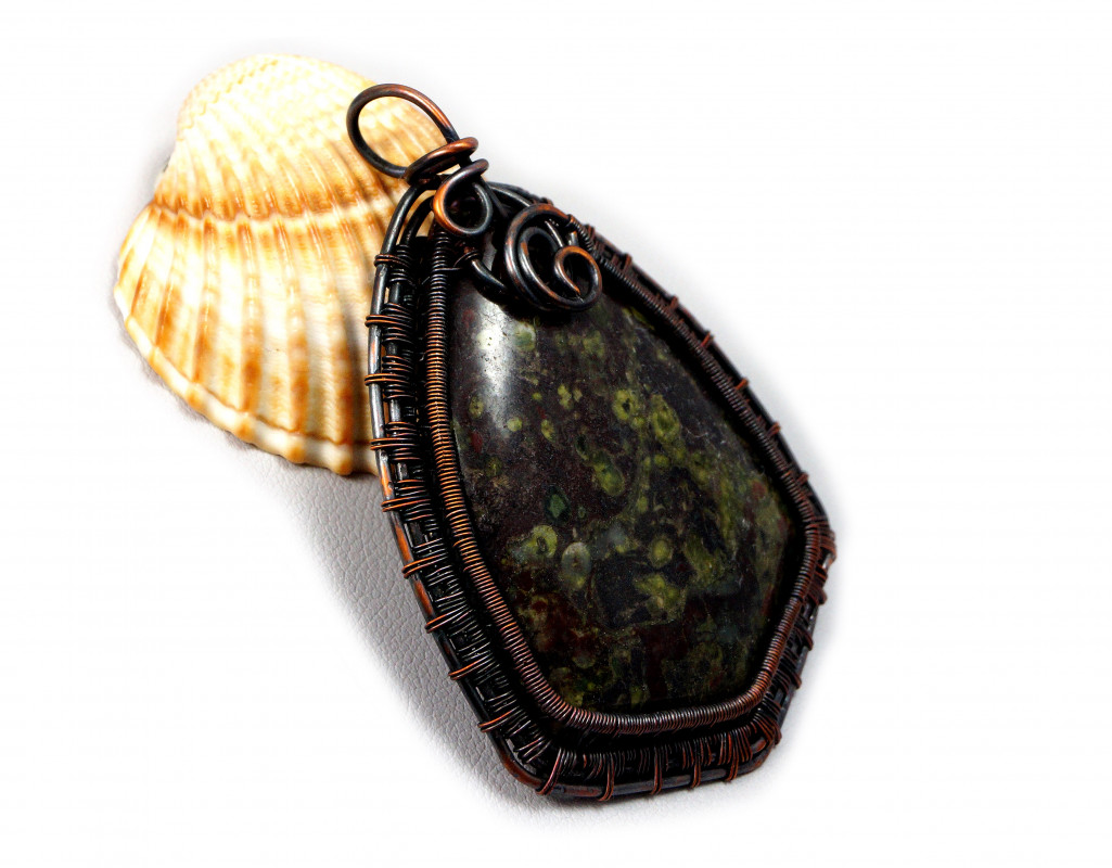 Bajeczny, misternie pleciony wisior z ciekawie wybarwionym plastrem kamienia krwistego. Wisior wykonany przeze mnie od podstaw bardzo pracochłonną i precyzyjną techniką wire-wrapping z patynowanej miedzi. Wymiary: wysokość: 5.9 cm szerokość: 4 cm waga: 25.2 gram Kupujesz wisior z czarnym Eco rzemieniem o długości 55 cm. Wisior zapakowany zostanie w ozdobne pudełeczko na biżuterię.