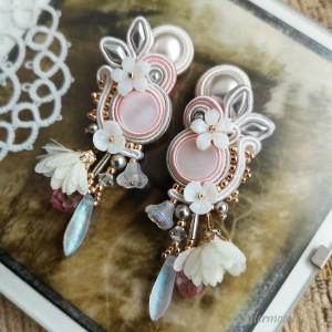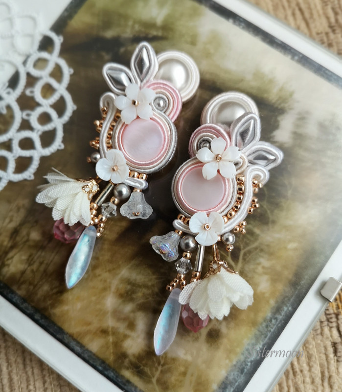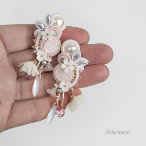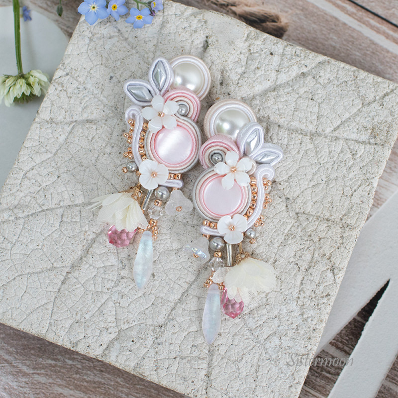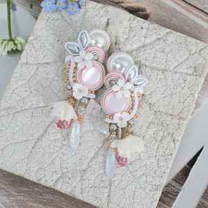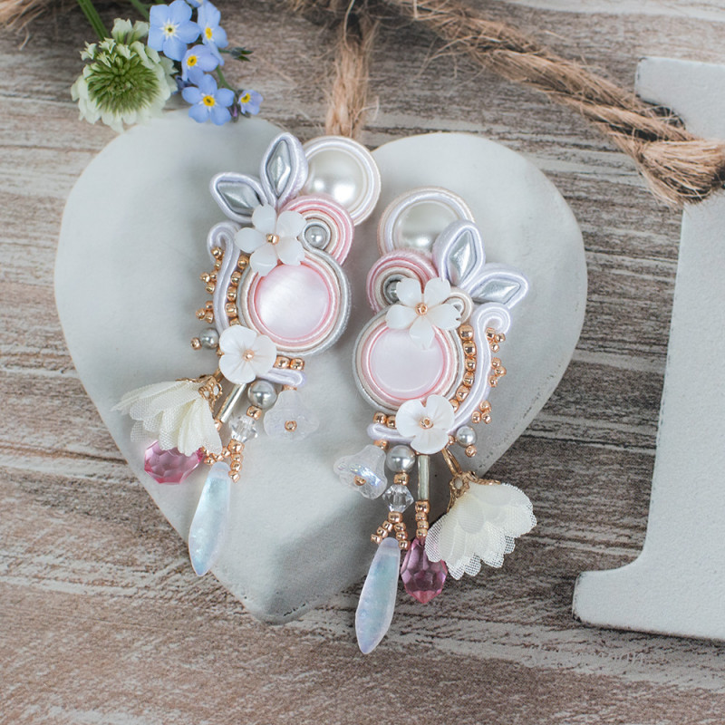 Kolczyki ślubne sutasz w eleganckiej, romantycznej odsłonie. Tonacja biel, srebro, pudrowy róż, odrobina stonowanego złota. Wykonane z materiałów wysokiej jakości: kaboszony z masy perłowej, perełki Swarovskiego, kryształki szklane, kwiaty z masy perłowej, materiałowe kwiatki jasny krem, czeskie koraliki Diamond, japońskie koraliki Toho, bigle otwarte antyalergiczne (do wyboru otwarte lub zamknięte). Całość starannie wykonana. Spód wykończony naturalną skórką. Wysokość całkowita 8 cm (w tym 1,5 cm bigiel), szerokość 2,5 cm.