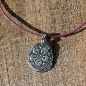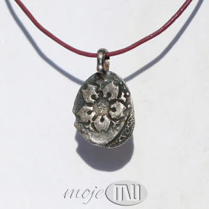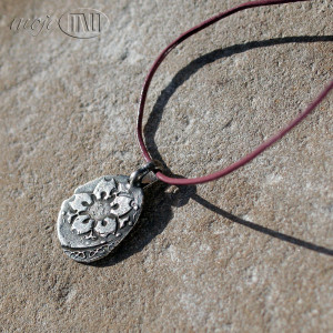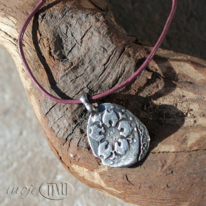 Nieregularny w kształcie wisiorek ze stylizowanym kwiatkiem. Zrobiłam go ręcznie ze srebra próby min. 925. Całość jest oksydowana i częściowo polerowana dla lepszego wydobycia faktury. Wisiorek zawieszony jest na skórzanym rzemyku w kolorze brudnoróżowym o gr. 1 mm. Wyrób jest sygnowany imiennikiem.