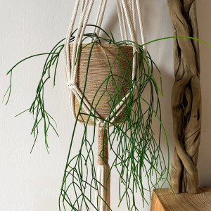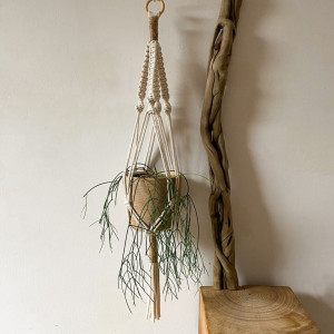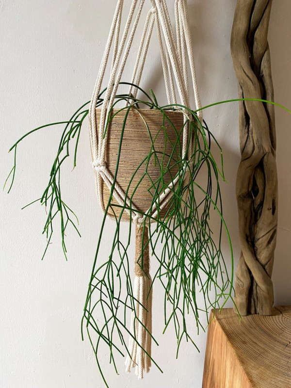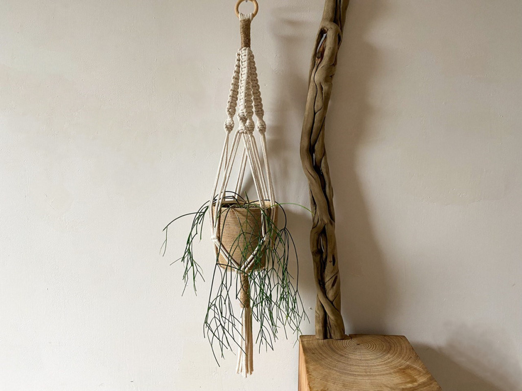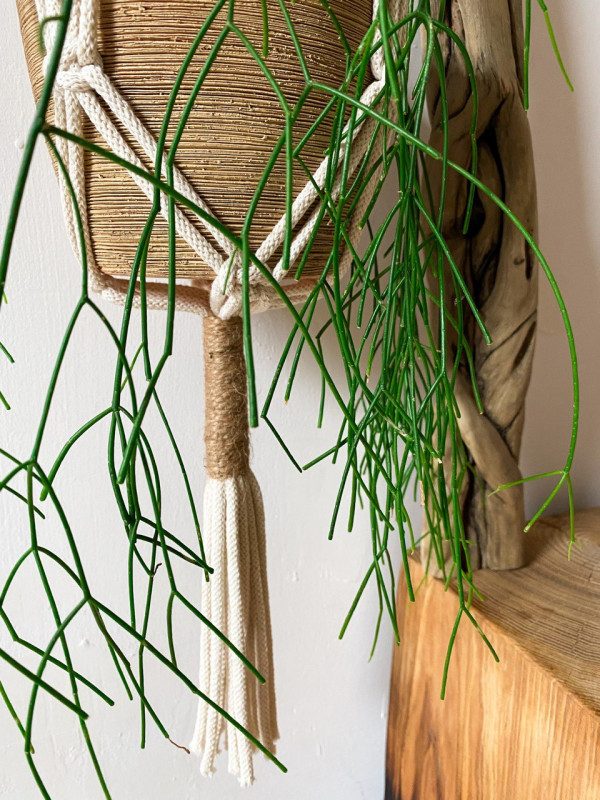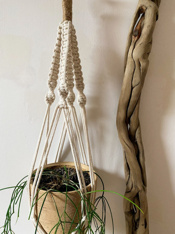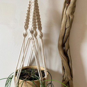 Kwietnik wykonany techniką makramy ze sznurka bawełnianego, plecionego o grubości 5 mm oraz sznurka jutowego.
