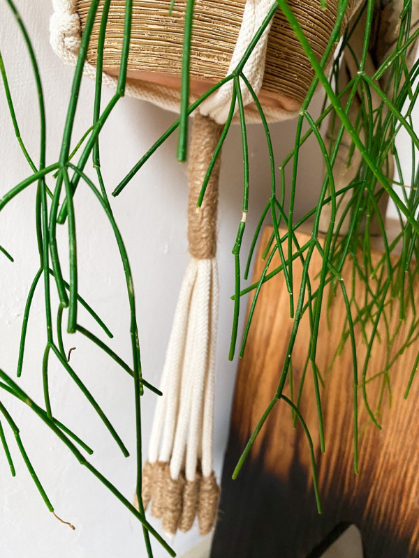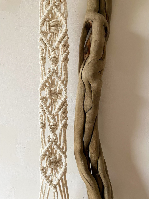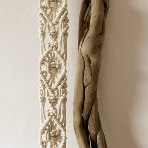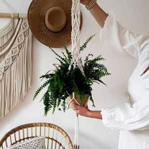 powieś na niej makramę. Makrama posiada odpowiednią zawieszkę do zawieszenia.