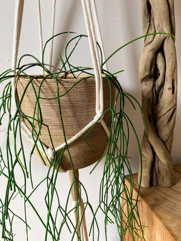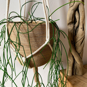 Kwietnik w kolorze złamanej bieli z elementami sznurka jutowego. Wykonany techniką makramy ze sznurka plecionego o grubości 5 mm. Istnieje możliwość wykonania w dowolnych kolorach. Dostosowany do doniczki 15-18 cm z płaskim lub okrągłym spodem.