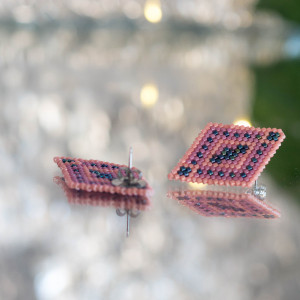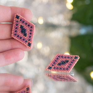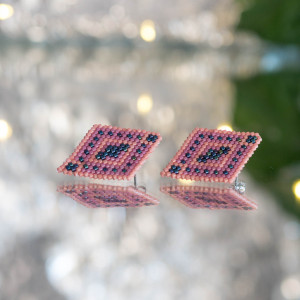 Lajla, czyli kolczyki o kształcie latawca. Wyplecione ręcznie z drobnych szklanych koralików wysokiej jakośći (Miyuki lub Toho), a zamocowane na sztyfcie ze stali chirurgicznej (316L).