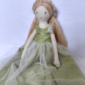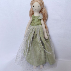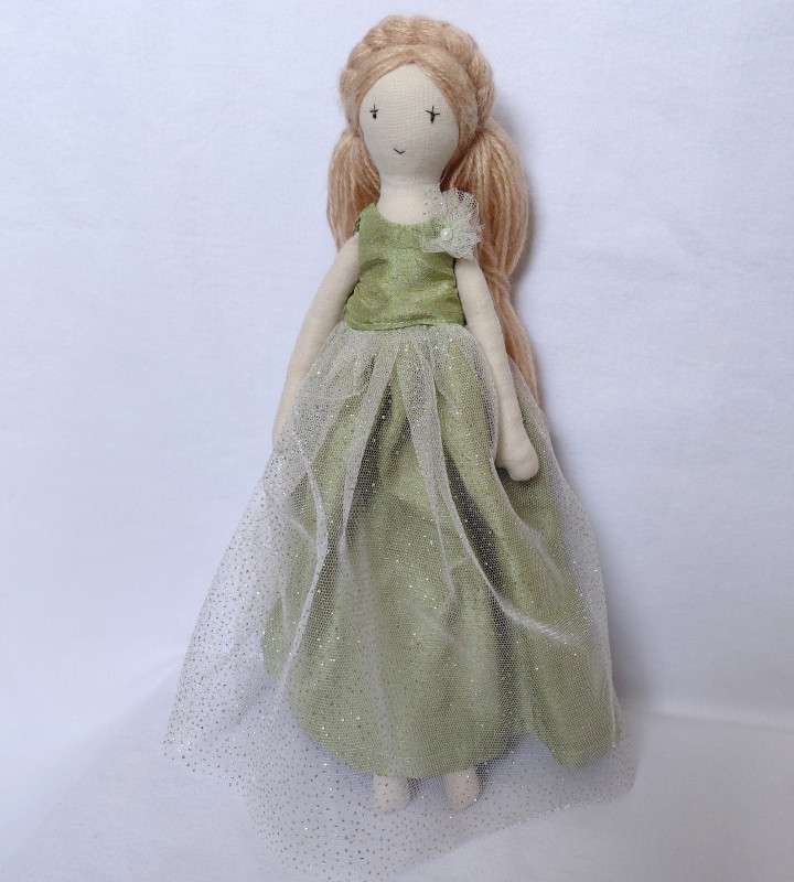 W zestawie: lalka, zielona sukienka balowa z tiulem (zapinana na zatrzask), sukienka niebieska (zapinana na rzep)