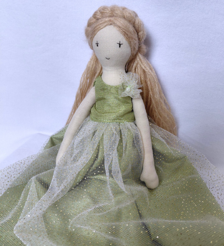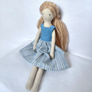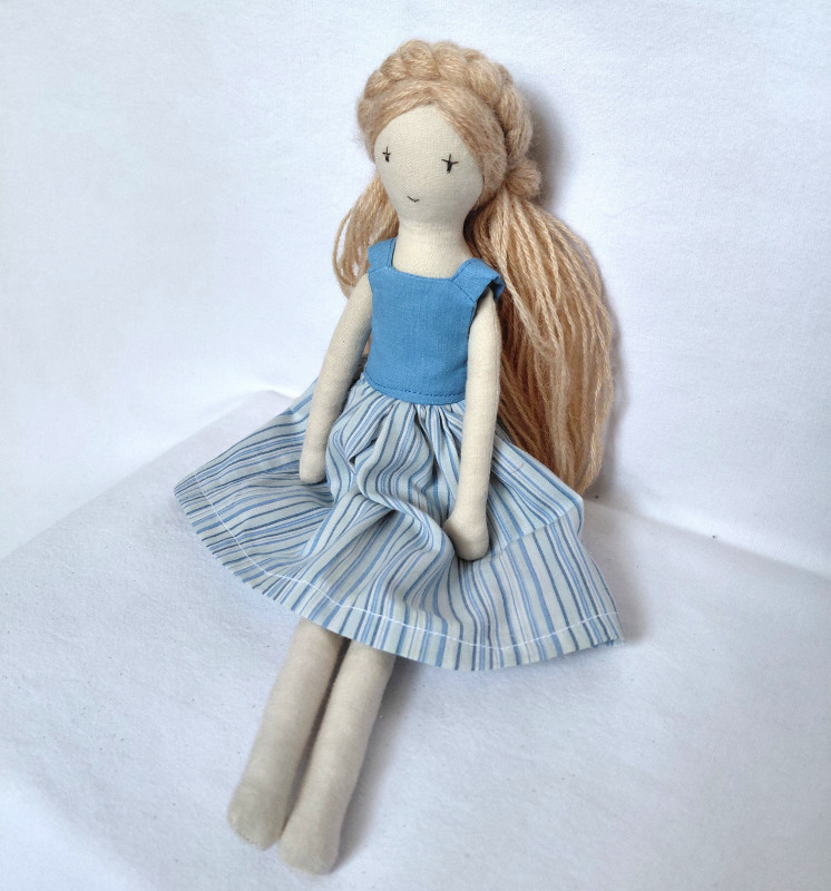 Lalka ma około 30 cm wysokości. Ręce i nogi ruchome. Uszyta z płótna bawełnianego i wypełniona kulką silikonową. Jest miękka i elastyczna. Podwójne szwy. Wzmocnia przy rękach i nogach. Włosy z włóczki mieszanki wełny i akrylu zebrane w dwa kucyki po bokach. Można tworzyć różne fryzury, pleść warkocze. Co tylko podpowie wyobraźnia. Oczy i buzia wyszywane. Lalka nie stoi samodzielnie.