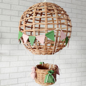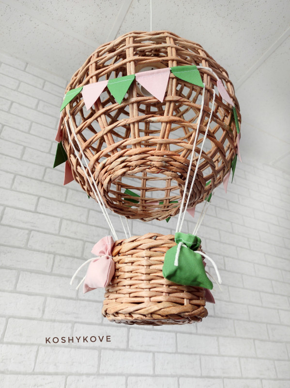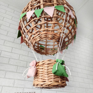 Efektowny wiszący abażur w formie latającego balona z koszem ozdobiony chorgiewkami w dowolnej kolorystyce. Doskonale sprawdzi się, jako prezent dla nowo narodzonego maleństwa. Dekoracja wykonana ręcznie z ogromną dbałością o każdy szczegół, co gwarantuje jej oryginalność i niepowtarzalny charakter.