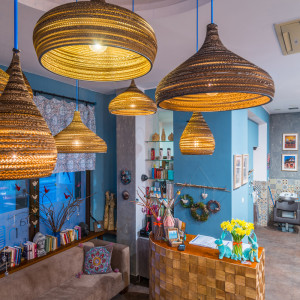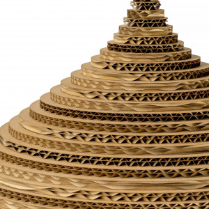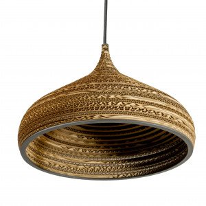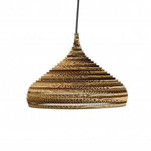Ekologiczna lampa wykonana z tektury falistej i sklejki brzozowej. Lampa wycięta laserem, sklejana ręcznie klejem nie emitującym szkodliwych substancji oraz zaimpregnowana lakierem akrylowym. Fragmenty lampy wykończone ringami ze sklejki liściastej dodającymi elegancji i zabezpieczającymi przed uszkodzeniami. Lampa wyposażona w kabel z oplotem o długości 1,2 m, czarną rozetkę maskującą i czarną oprawkę przystosowaną do żarówek energooszczędnych E27. Ze względu na ręczne wykonanie każda lampa to produkt unikatowy i może się nieco różnić od egzemplarza przedstawionego na zdjęciach.