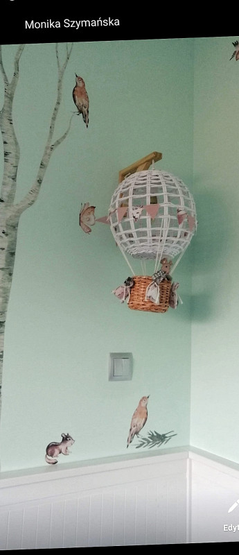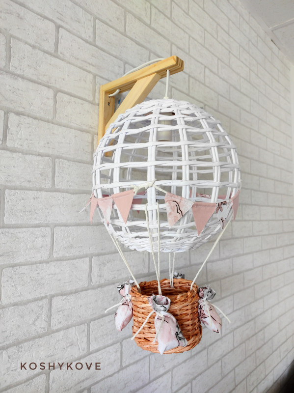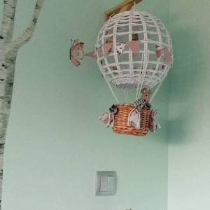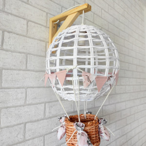 Efektowny wiszący abażur w formie latającego balona z koszem ozdobiony chorgiewkami w dowolnej kolorystyce. Doskonale sprawdzi się, jako prezent dla nowo narodzonego maleństwa.