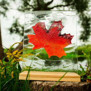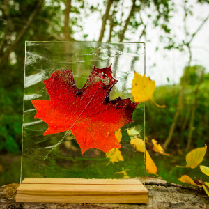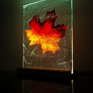 W zestawie: drewniana podstawka z LED (ręcznie wykonana), zasilacz i dotykowy regulator jasności.