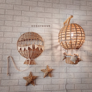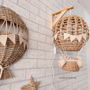 Efektowny wiszący abażur w formie latającego balona z koszem ozdobiony chorgiewkami w dowolnej kolorystyce. Doskonale sprawdzi się, jako prezent dla nowo narodzonego maleństwa.