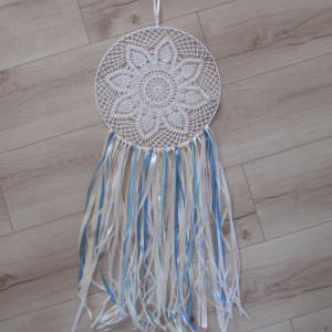 Łapacz snów wykonany ręcznie na metalowej obręczy, o średnicy 30 cm. Środek wykonany na szydełku, całość uzupełniona o wstążeczki satynowe w różnych odcieniach niebieskiego, ecru oraz białego. Długość całowita 78 cm.