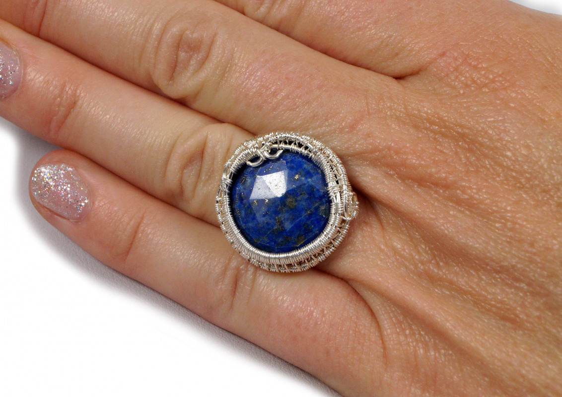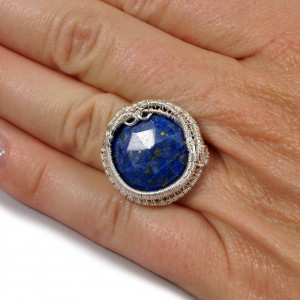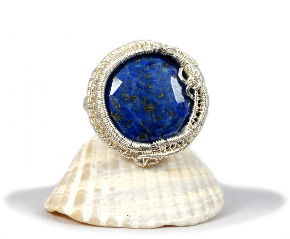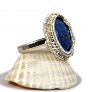 Misternie wykonany pierścionek z fasetowanym kaboszonem lapis lazuli w niebiesko złotym kolorze. Pierścionek wykonany w bardzo pracochłonnej technice wire-wrapping ze srebra próby 930 oraz 999. Wymiary: Rozmiar EU: 15 Średnica obrączki wewnętrzna (regulowana): 17.5 mm Grubość obrączki: 3 mm Wielkość kamienia: 20 x 20 mm Pierścionek zapakowany zostanie w ozdobne pudełeczko na biżuterię.