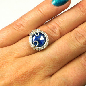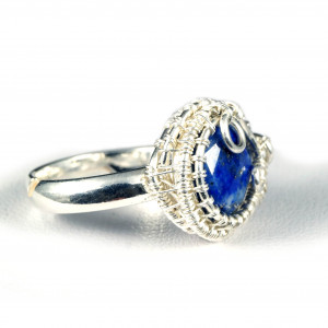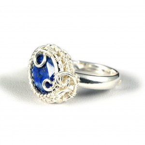 Misternie wykonany pierścionek z kaboszonem lapis lazuli. Całość wykonana ręcznie ze srebra próby 925, 930 i 999. Pierścionek wykonany w bardzo pracochłonnej technice wire-wrapping. Rozmiar od 11 - 15 EU Średnica obrączki wewnętrzna: 16 mm - 17.3 mm Grubość obrączki: 3 mm Wielkość kamienia: 10x10 mm Pierścionek zapakowany zostanie w ozdobne pudełeczko na biżuterię.