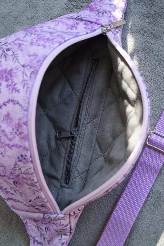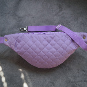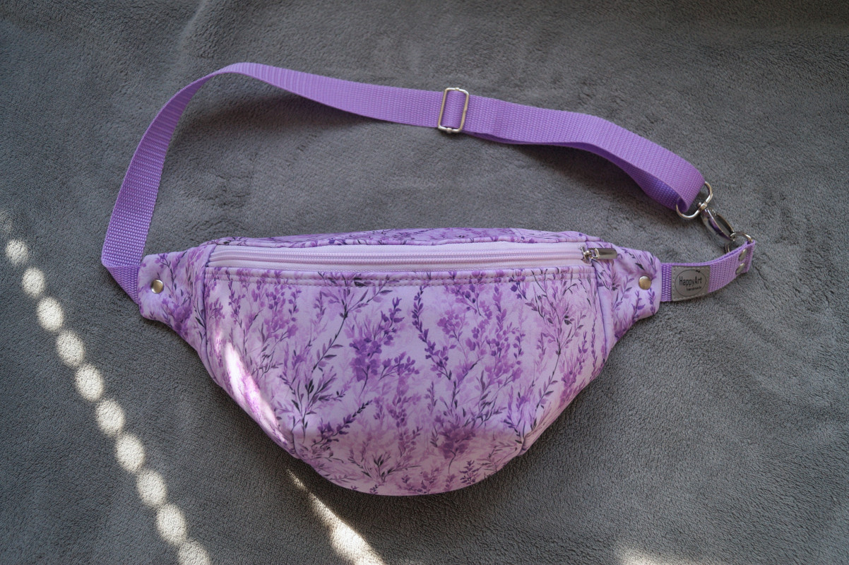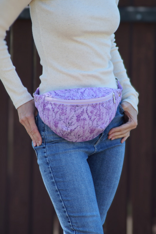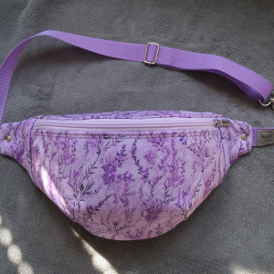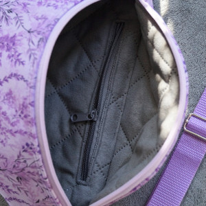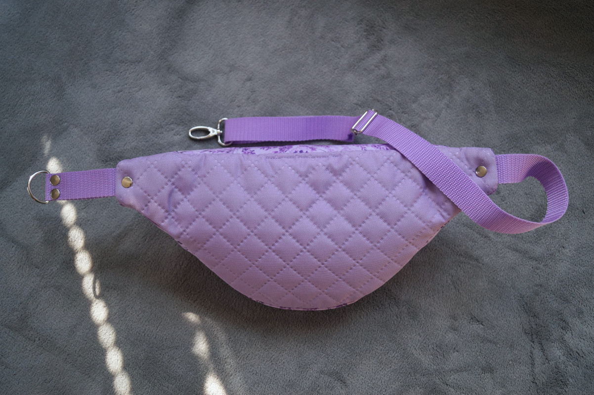 Saszetka/nerka do noszenia w pasie, wykonana z wodoodpornego softshellu w odcieniach fioletu z nadrukiem kwiatów lawendy oraz z pikowanej jasnofioletowej tkaniny oxford.
