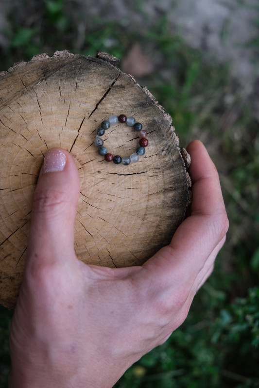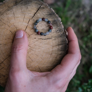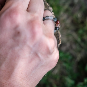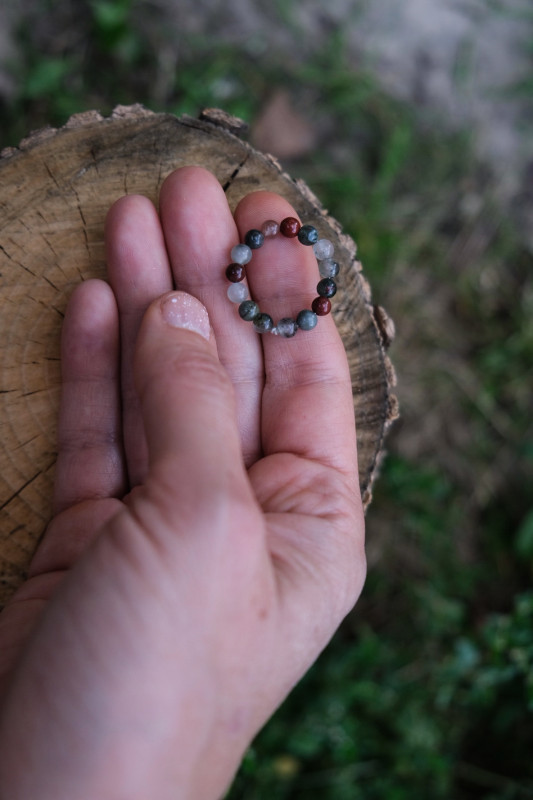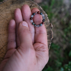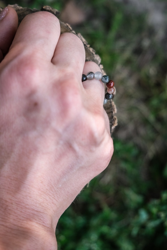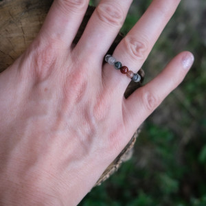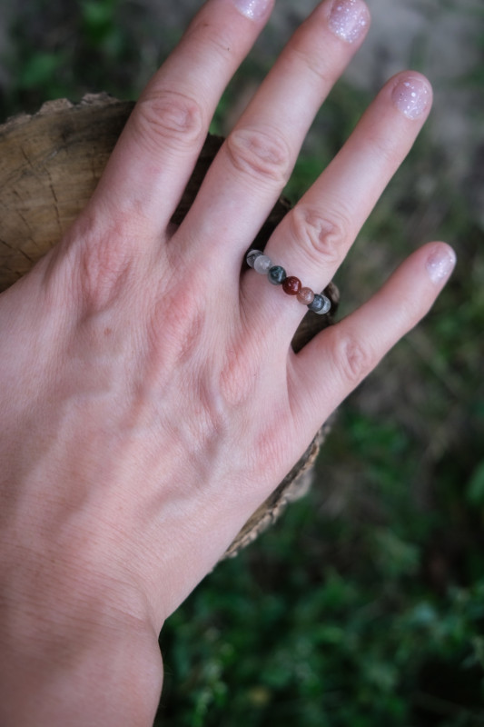 Minimalistyczny, drobniutki pierścionek wykonany z kamieni mineralnych (HELIOTROPU) i linki stalowej jubilerskiej najwyższej jakości.