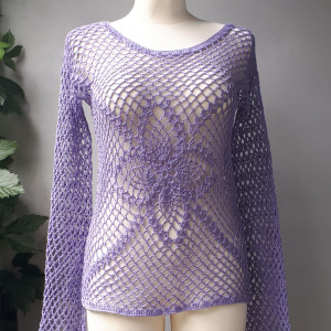 Bluzka zrobiona ręcznie na szydełku z nitki w składzie 1p0 % bawełna w kolorze lila. Super sprawdzi się noszona na topy w o różnych kolorach. Rozmiar uniwersalny, będzie pasował na Panie noszące rozmiar 36-40, Długość bluzki 64-66cm, Długość rękawa 60-63cm, Obwód do 100 cm. Prac ręcznie w temperaturze 30 stopni, suszyć na leżąco.