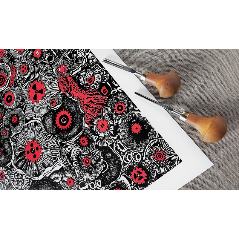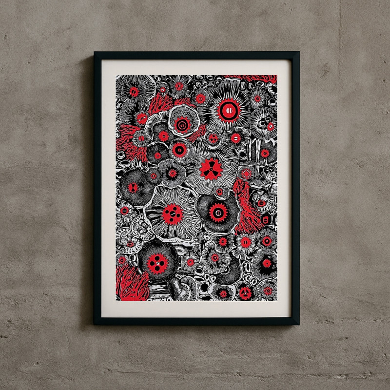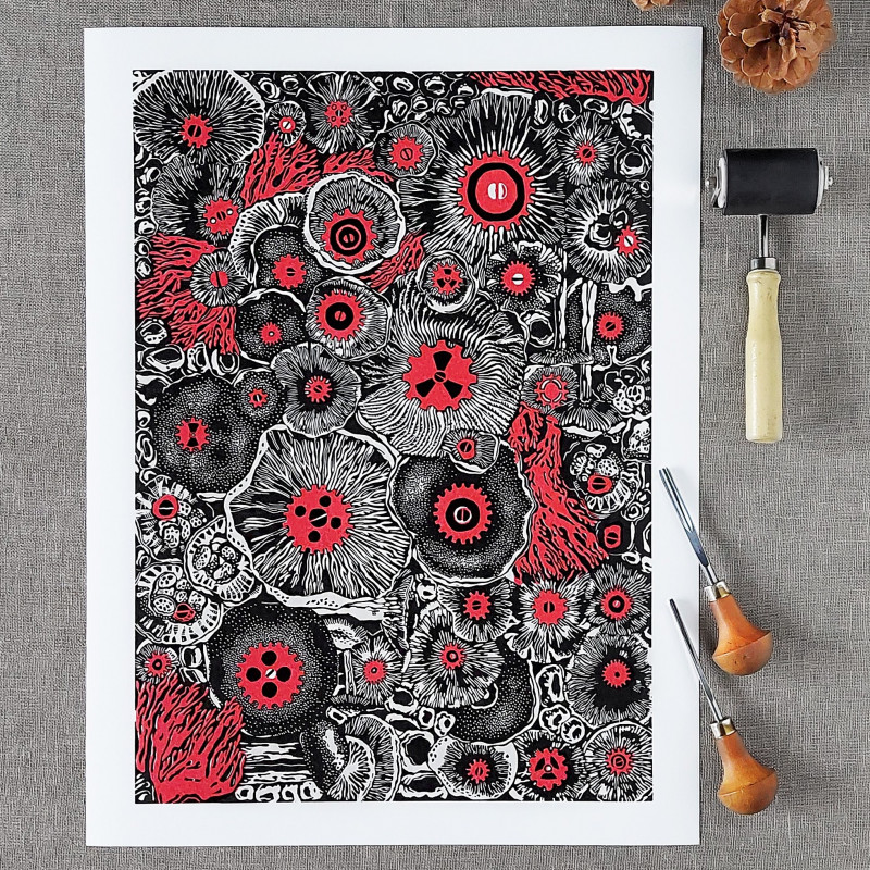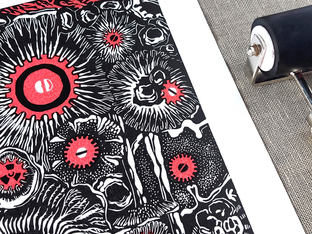 Przedstawiona grafika linoryt inspirowana jest światem grzybów, zarodników i organicznych form.