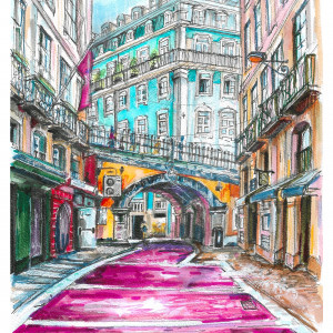 W pracy użyłem akwareli, tuszu i markerów wodnych, by uchwycić lekkość i ulotność tej scenerii. Wybór tych technik nie był przypadkowy – chciałem, by warstwy kolorów i detali budowały głębię, podobnie jak Lizbona składa się z wielu warstw historii, kultur i wpływów.