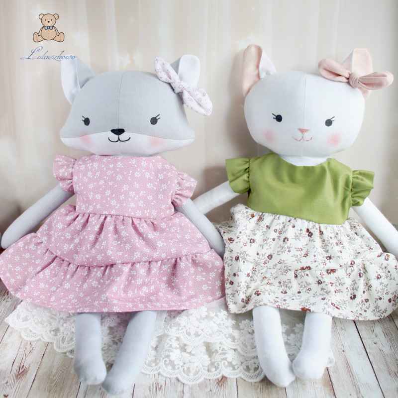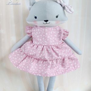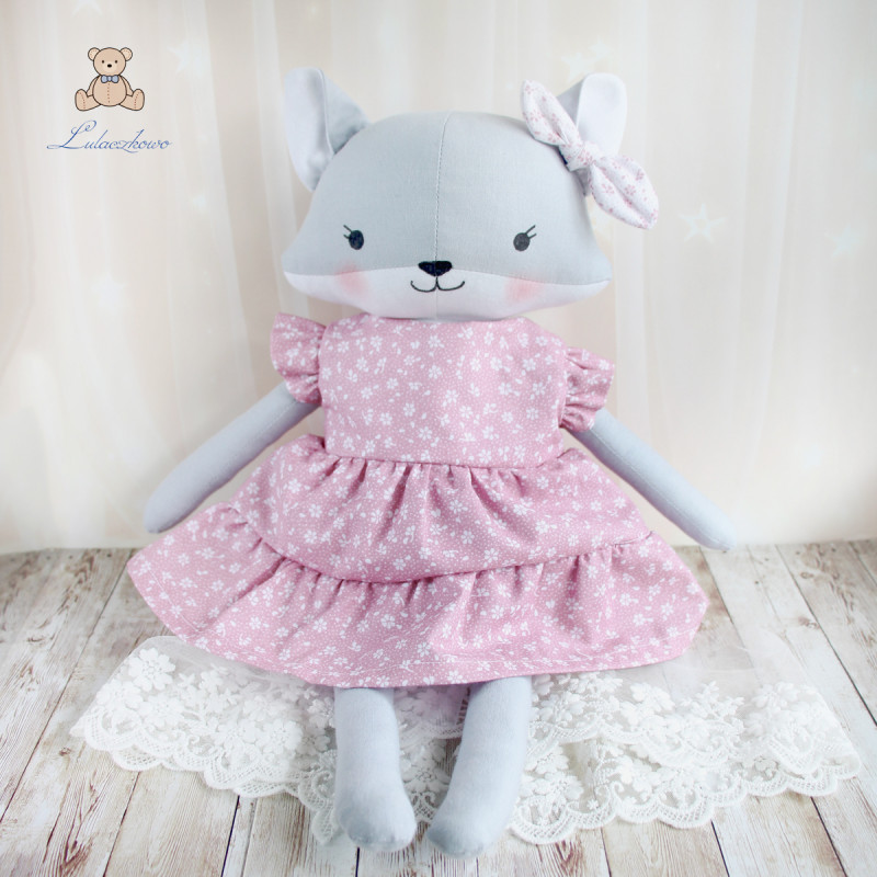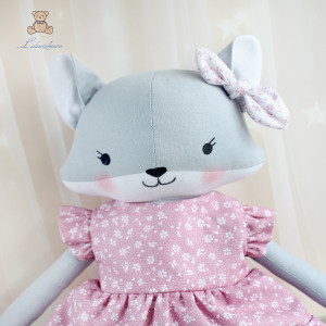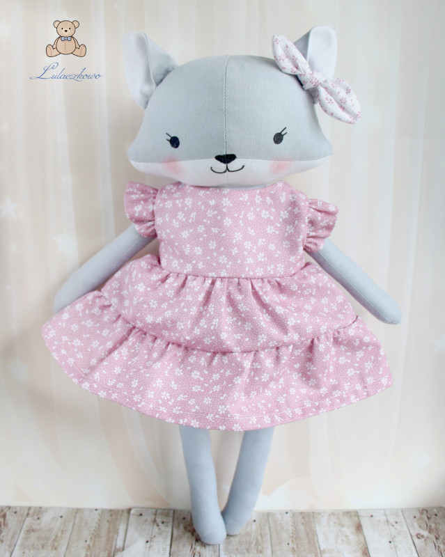 Przeurocza przytulanka, lisek a właściwie lisiczka w odcieniach szarości i bieli, uszyta ręcznie z najwyższą starannością, ubrana w kwiatową sukieneczkę z falbankami w kolorze róż retro. Wykonana ze 100% bawełny, wypełniona antyalergiczną kulką silikonową. Oczka, nosek i uśmiech malowane wodoodpornym markerem, uszko ozdobione kokardką. Bluzeczkę można swobodnie zdejmować, zapinana jest na rzep, spodenki również - w pasie posiadają gumeczkę. Górne i dolne łapki układają się luźno, lisiczka siedzi z podparciem.