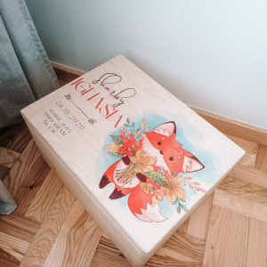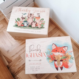 Pudełko z drewna, dostępne jest w 4 wariantach wielkości: małe (30x20x12), kwadratowe (30x30x12), średnie (40x30x12) i duże (40x30x22). Posiadają z boku wycięte uchwyty (z wyjątkiem pudełka kwadratowego). Pomieści wiele skarbów dziecka, albo pierwsze wspomnienia: zdjęcie USG, pierwszą pieluszkę, body, smoczek, zdjęcie z rodzicami. Będzie wspaniałą pamiątką i wspomnieniem dziecka z dzieciństwa. To piękny prezent z okazji narodzin, czy chrztu, do wewnątrz można włożyć kocyk, pościel, bodziaki, itp i skomponować w ten sposób wspaniały prezent dla maluszka.