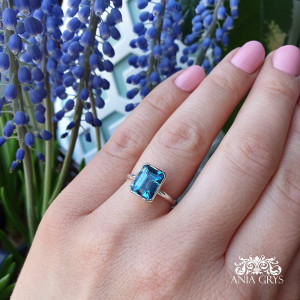 Elegancki, ponadczasowy pierścionek wykonany ręcznie ze srebra. W klasycznej oprawie zakuty został zjawiskowo piękny, intensywnie niebieski Topaz London Blue. Wymiary kamienia 6x8mm, Masa 2ct. Rozmiar 11. Przed wysyłką zostanie elegancko zapakowany w pudełeczko prezentowe. Istnieje możliwość zamówienia innego rozmiaru. Zapraszam!
