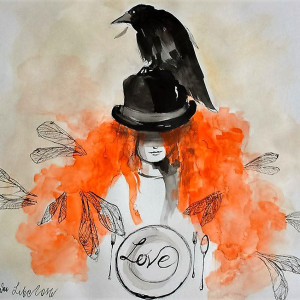 "Love" akwarela z dodatkiem piórka wykonana na białym 300g papierze o wymiarach 40cm x 40cm. Praca sygnowana, wysyłana w kartonowej tubie, by dotarła do Państwa w idealnym stanie.