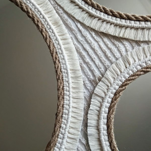 Makramowa ramka wykonana jest z najwyższej jakości sznurka bawełnianego. Jest usztywniona i wystabilizowana moją autorską metodą dzięki czemu utrzymuje swój kształt, zachowując przy tym naturalną strukturę sznurka bawełnianego. Nie trzeba jej czesać ani układać po otrzymaniu.