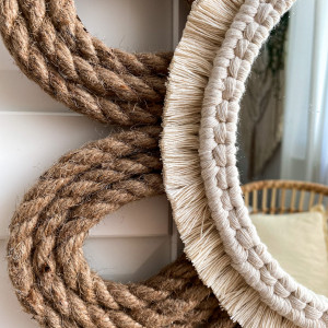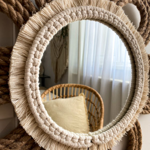 Lustro w ramie wykonanej techniką makramy ze sznurka bawełnianego o grubości 3 mm z elementem liny jutowej. Makramowa ramka wykonana jest z najwyższej jakości sznurka bawełnianego. Jest usztywniona i wystabilizowana moją autorską metodą dzięki czemu utrzymuje swój kształt, zachowując przy tym naturalną strukturę sznurka bawełnianego. Nie trzeba jej czesać ani układać po otrzymaniu.