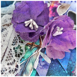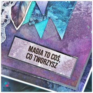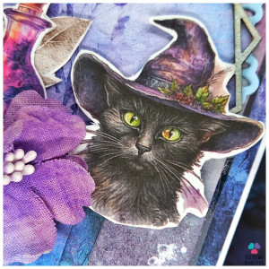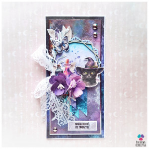 W głównej części kartki znajduje się srebrna obręcz, na której jest czarny kot w kapeluszu czarownicy. Jego błyszczące oczy patrzą prosto na Ciebie. Obok grafiki kota znajduje się kokarda z białej koronki i dwa fioletowe kwiaty. Na kartce został umieszczony też napis "Magia to coś, co tworzysz".
