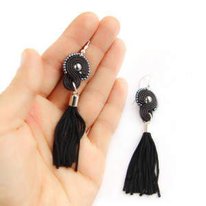 Leciutkie kolczyki w kolorze czerni i grafitu. Haftowane z sutaszu, z perłami Swarovski. Chwosty efektownie kołyszą się przy każdym ruchu. Długość kolczyków: ok. 8,5 cm. Bigle ze srebra.