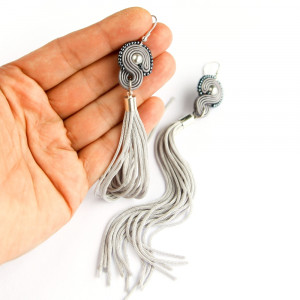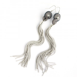 Leciutkie kolczyki w srebrzystym odcieniu szarości z długimi frędzlami. Haftowane z sutaszu, z perłami Swarovski. Chwosty efektownie falują i kołyszą się przy każdym ruchu. Długość kolczyków: ok. 17 cm Bigle ze srebra.