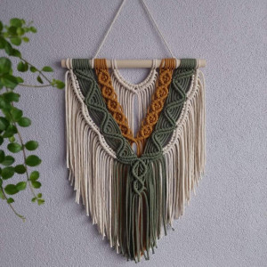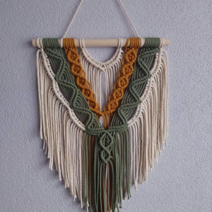 Makrama ze sznurka bawełnianego 5mm i 3mm. Wymiary to szerokość patyka 40cm, długość od patyka ok 60cm. Jest możliwość wykonania w innym kolorze. Piękna ozdoba na ścianę w stylu boho.
