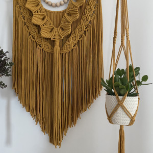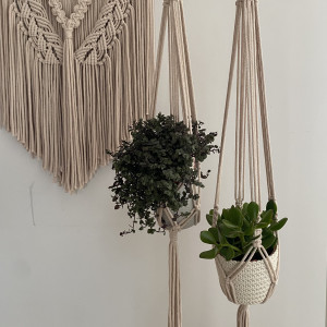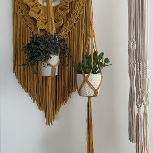 Makramowy kwietnik wiszący, wykonany z bawełnianego sznurka o grubości 5mm.