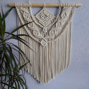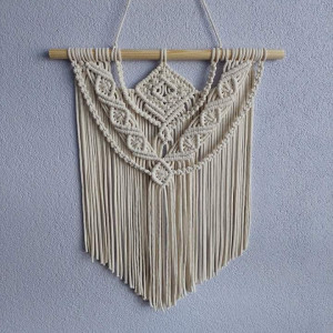 Makrama ze sznurka bawełnianego 5mm, wymiary to szerokość patyka 50cm, długość od patyka ok 60cm. Jest możliwość wykonania w innym kolorze. Piękna ozdoba na ścianę w stylu boho.