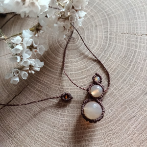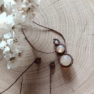 Naszyjnik z naturalnymi kamieniami - jadeitem i kwarcem różowym oraz szklanymi koralikami, wykonany w technice mikromakramy ze sznurka woskowanego w kolorze brązowym, w całości ręcznie, z serca i z dbałością o każdy szczegół.