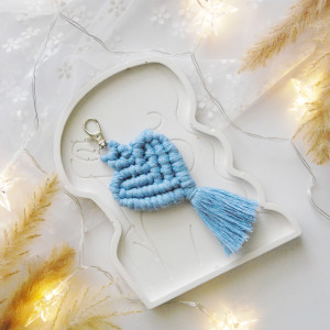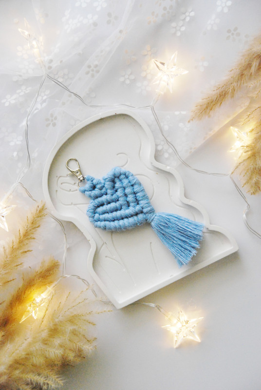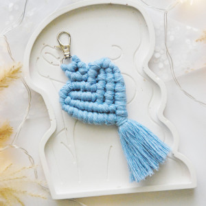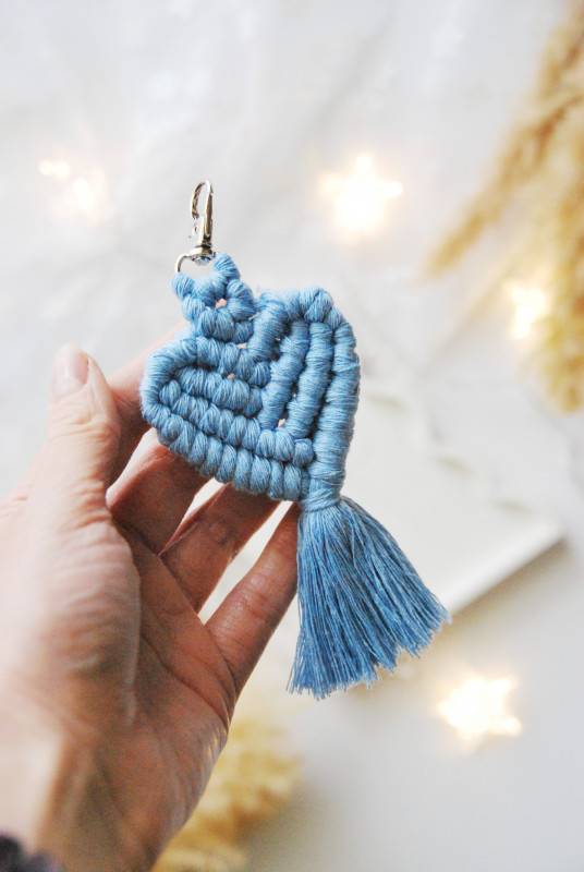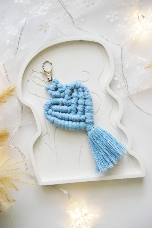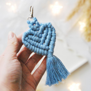Ten uroczy brelok w kształcie serca został wykonany z miękkiego, bawełnianego sznurka w pastelowym, błękitnym odcieniu. Dzięki starannie splecionym węzłom makramy zachwyca swoją fakturą i wyjątkowym urokiem.
