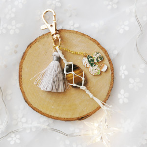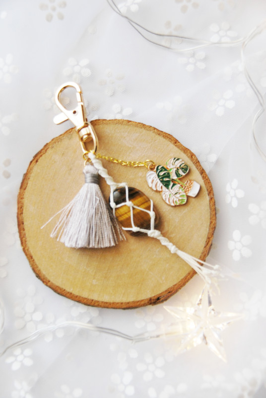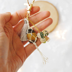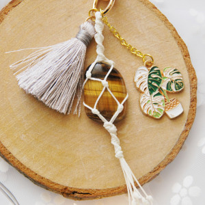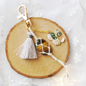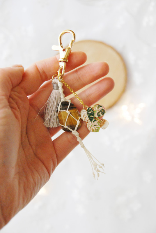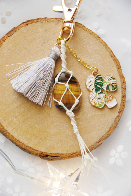 Makramowy breloczek z kamieniem - tygrysie oko | Brelok z kamieniem
