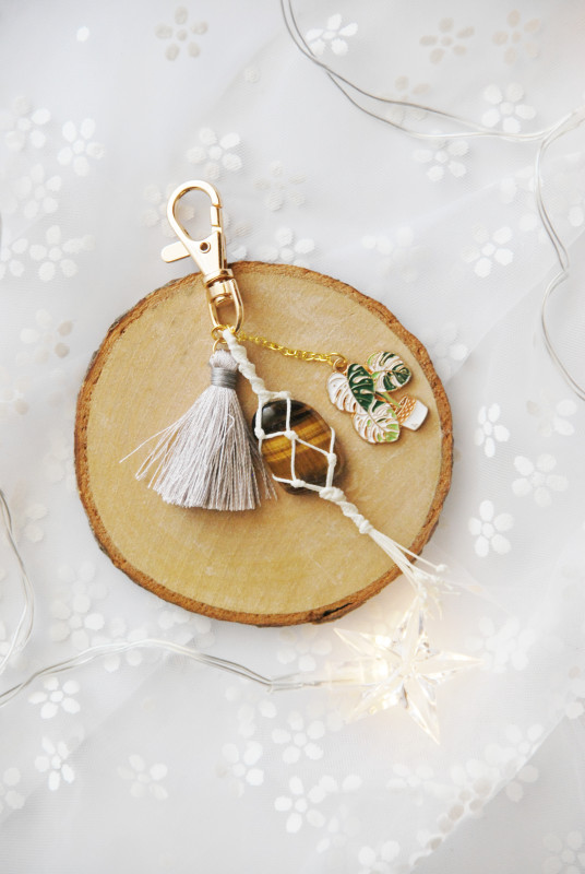 Makramowa oprawa - ręcznie pleciona z wysokiej jakości sznurka w kolorze białym, nadaje breloczkowi stylu boho i lekkości.