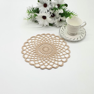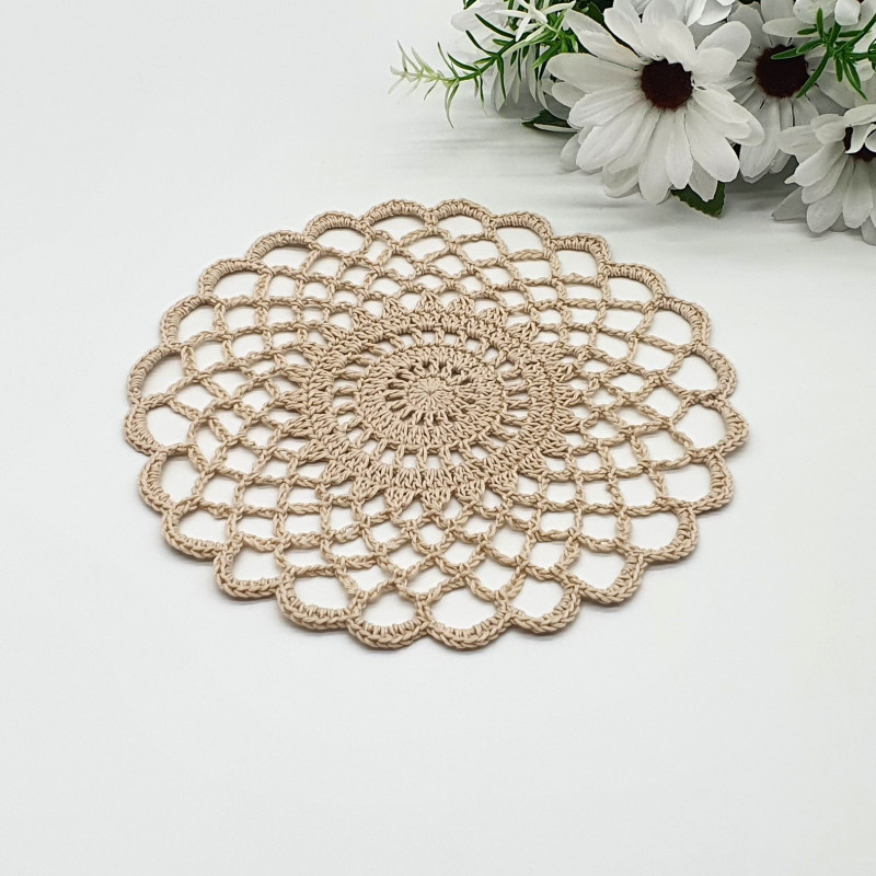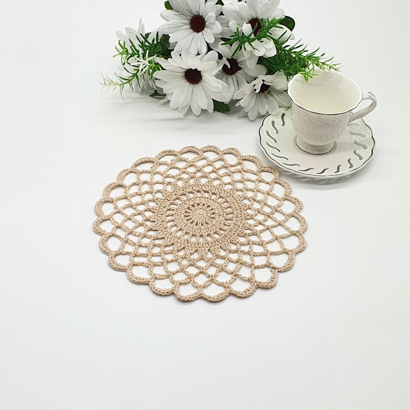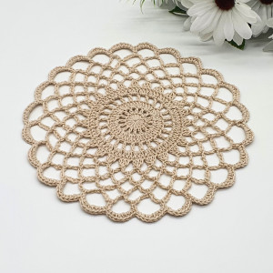 Serwetka w kolorze ecru, wykonana została na szydełku, z kordonka wyprodukowanego w Polsce. Średnica serwetki to 20 cm.